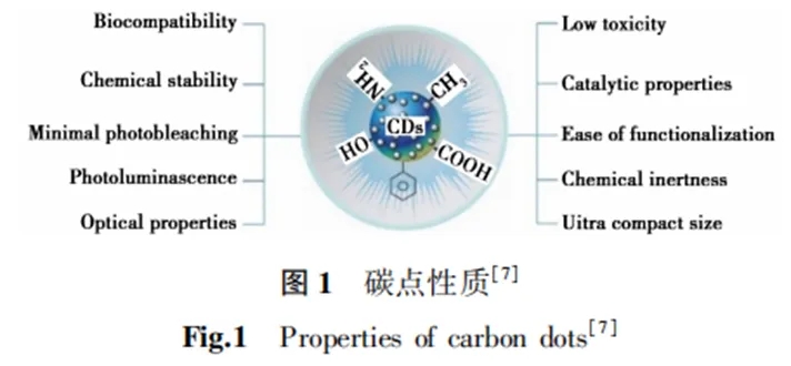一般认为,CDs是由直径<10 nm的碳元素组成。CDs具有良好的水稳定性、易于功能化、毒性小、荧光强、光色可调、具有较高的光稳定性[7](图1)。