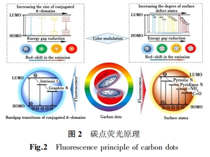 虽然当前对CDs荧光发射机制尚未有定论,本文仅对现有CDs的一般荧光机制归纳,如图2所示。