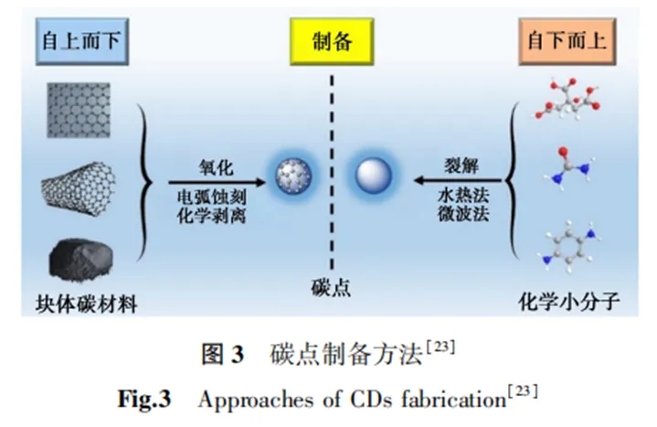 经过近20年发展,CDs的制备方法趋于简化和高效,制备方法可分为自上而下(Top-Down)和自下而上(Bottom-Up)两种方法[23],如图3所示。