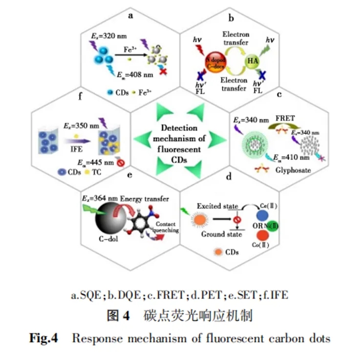 在检测领域,CDs荧光通常用作响应信号构建荧光传感器,当目标分析物与CDs荧光传感器发生相互作用时,往往引起CDs荧光变化包括荧光猝灭或荧光增强,因此通过荧光比色法可实现传感器构建,如图4所示。