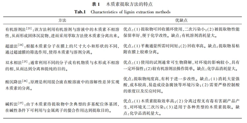 目前针对木质素的提取,常用的方法如表1所示,包括碱法、酸法和有机溶剂法等。