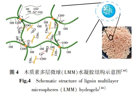 如图4所示,Zhang等[44]首次使用多巴胺和海藻酸钠组装了木质素多层微球(LMM)水凝胶,其主要机制为静电引力和表面络合作用吸附重金属离子。