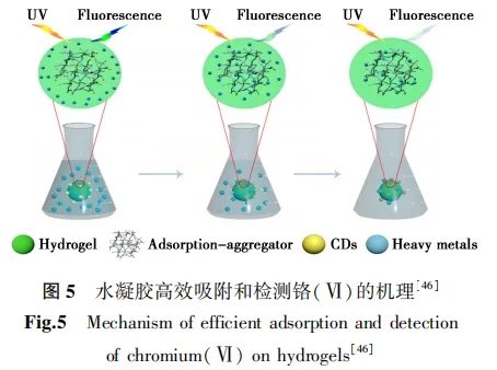 如图5所示,Yuan等[46]合成了一种含纤维素纳米纤维和碳点(CD)的新型荧光木质素基水凝胶,用于木质素的高价值利用和对Cr6+的吸附。该水凝胶以木质素和CCN-CD构建了三维多孔结构,提供了许多离子转运通道和活性位点,稳定了荧光信号,使得对Cr6+吸附效果可视化。