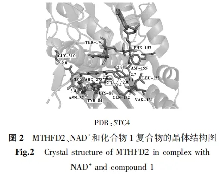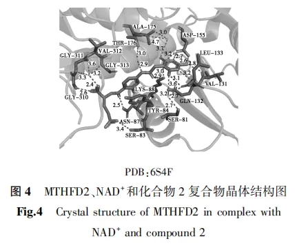 2022年,Bonagas等[31]采用底物引导的先导化合物优化策略,报道了具有高效力和选择性的MTHFD2抑制剂TH9619(化合物2,图3)。化合物2与MTHFD2复合物的晶体结构如图4所示。
