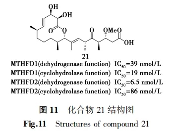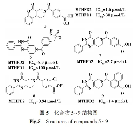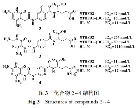 2017年,Gustafsson等[30]报道了第一种底物类似物MTHFD2抑制剂LY345899(化合物1,图1),并且揭示了MTHFD2与底物抑制剂、酶辅因子NAD+和无机磷酸盐配合物的第一个晶体结构。
