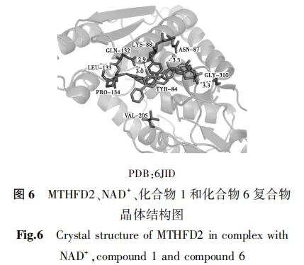 2019年,Kawai等[33]公开了一种新型具有三环香豆素骨架的选择性MTHFD2抑制剂DS44960156(化合物5,图5)。MTHFD2-化合物6复合物的X射线晶体结构如图6所示。