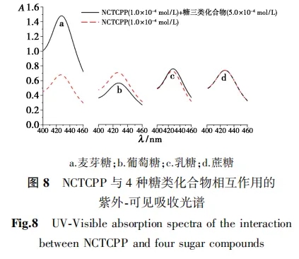 采用紫外-可见吸收光谱法测定N-错位卟啉与4种糖类分子(麦芽糖、葡萄糖、乳糖、蔗糖)的识别作用,所得谱图如图8所示。
