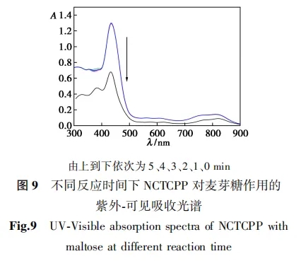 控制反应温度、麦芽糖的浓度等为常量,改变反应时间(0、1、2、3、4、5 min),采用紫外-可见吸收光谱法测定反应时间对NCTCPP与麦芽糖作用的影响,所得谱图如图9所示。