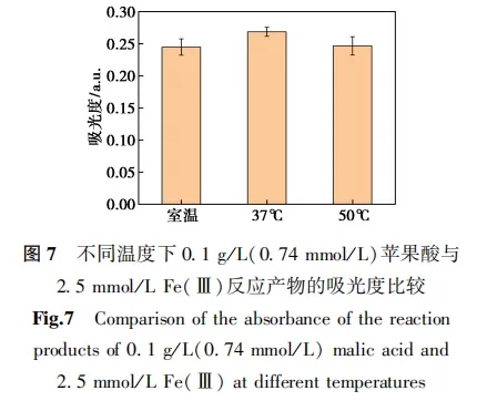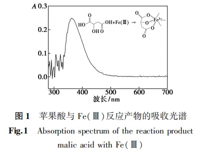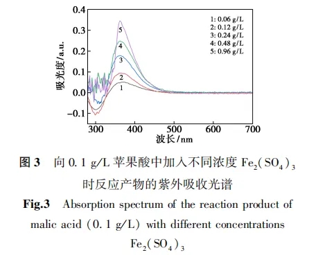 在确定了反应体系的酸度条件后,本课题组进一步测定了在加入不同浓度Fe2(SO4)3时,与0.1 g/L(0.74 mmol/L)苹果酸反应产物的吸收光谱变化,结果如图3所示。