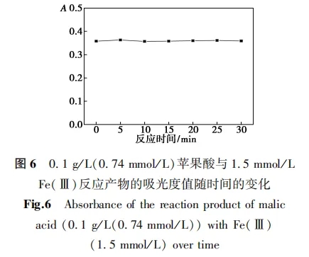 在0.1 g/L(0.74 mmol/L)苹果酸溶液中加入1.5 mmol/L Fe(III),混合均匀后立即测定吸光度并每隔5 min测定一次,共测定30 min,结果如图6所示。