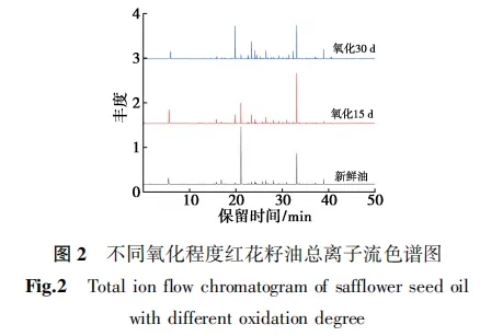 在整个氧化期间变化明显的为醇类物质和醛类物质,新鲜油、氧化15 d红花籽油、氧化30 d红花籽油样品总离子流色谱图,见图2。
