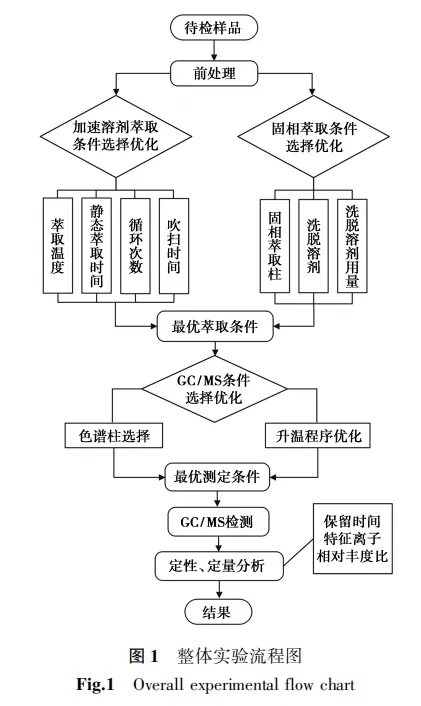 待检样品经加速溶剂萃取和固相萃取净化处理后,通过GC/MS进行测定。试验对加速溶剂萃取和固相萃取条件进行了选择和优化,同时优化了GC/MS测试条件,整体实验流程见图1。