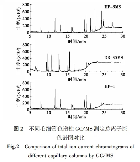 实验分别采用HP-5MS、HP-1、DB-35MS 3种毛细管色谱柱对16种1 mg/L多环芳烃标准工作液进行GC/MS测定,结果如图2所示。