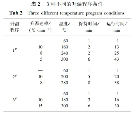 为进一步优化GC/MS条件,实验考察了3种不同升温程序下,16种目标物质的分离效果,升温程序见表2。