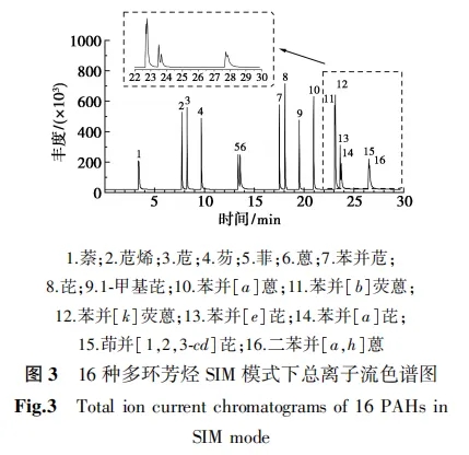 按照2.1.1 GC/MS条件实验又进一步对16种多环芳烃运用SIM扫描模式进行了测定,16种多环芳烃SIM模式下总离子流色谱图见图3。