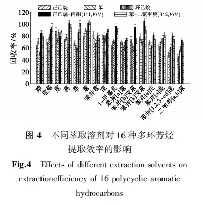 实验分别考察了以正己烷、苯、环己烷、V(正己烷):V(丙酮)=1:1、V(苯):V(二氯甲烷)=1:1作为提取剂时对16种多环芳烃提取效率的影响,其测试结果见图4。实验最终选择V(正己烷):V(丙酮)=1:1作为提取剂。