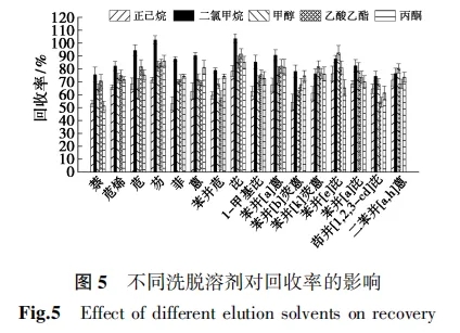 实验分别考察了以正己烷、二氯甲烷、甲醇、乙酸乙酯、丙酮作为MIP-PAHs固相萃取柱洗脱剂时对回收率的影响,选择用量均为10mL结果如图5所示。