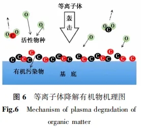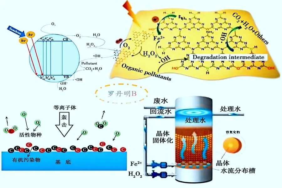 Fenton法对于难以生物降解废水、有毒有害等废水有着较为稳定的去除功效,但单独使用Fenton法费用较高,所以目前在一些情景下将Fenton法或光-Fenton法作为预处理方法或深度处理方法,再与其他处理方法(如生物法、超声波、混凝法以及活性炭等)联用,通过和这些方法联用进而降低处理废水的成本,提高降解效率。等离子体技术对RhB及其他难降解有机物的降解机理类似,通过等离子体中的高能电子、活性自由基与难降解有机物分子相互作用,使其发生分子链的断裂或通过将其氧化成易降解物质,通过调控等离子体能量以及等离子体装置结构,可以有效控制降解产物种类及浓度,从而实现有机污染物的高效绿色降解,其机理如图6所示。.jpg)