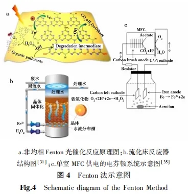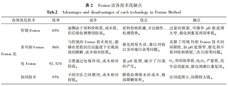 电Fenton法将电化学技术和Fenton技术相结合,是一种更高效的高级氧化技术。电Fenton技术通过电场作用,阴极处的氧气通过还原反应生成H2O2, H2O2与溶液中的亚铁离子反应生成具有强氧化性的•OH和Fe3+,同时Fe3+ 会在阴极表面连续不断地还原成Fe2+。电Fenton技术的优点是可以在宽pH范围内有效降解有机污染物,同时减少了污泥的产生。而其缺点是工作pH值窄、O2利用效率低、H2O2产量低、化学品用量高以及催化剂难以重复使用。为了克服传统电Fenton技术中的挑战,一些研究人员提出了改进措施。例如,使用商业钼粉作为助催化剂,以降解有机污染物[32]。该方法在较宽pH值范围内有效地降低了能耗,并且在10次循环后,RhB降解率也可以连续保持在92.52%以上。在实际应用中,需要针对具体情况选择合适的电Fenton工艺方案,并优化反应条件以提高处理效率和经济性。赵佳等[33]采用乙二胺二琥珀酸(EDDS)强化Fe3+/ H2O2体系降解RhB,EDDS易与金属离子配合,属于易生物降解有机物,它的加入可避免引入二次污染的问题。2.2.3 Fenton法与其他方法联合