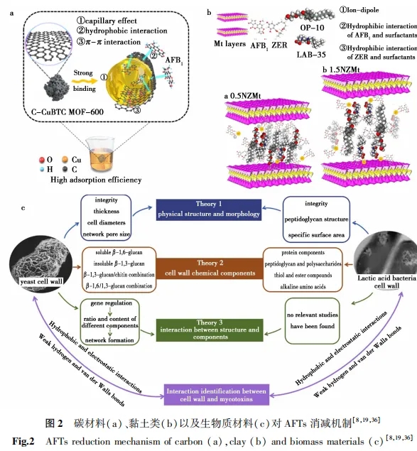 食品及农产品中常用于消减AFTs的黏土类材料主要有硅铝酸盐、膨润土、活性白土、蒙脱石、坡缕石以及凹凸棒等。其中,膨润土和蒙脱石是研究最广泛的吸附剂,在饲料、奶制品、葡萄酒、植物油以及谷物制品中均有研究。Vila等[9]发现膨润土可以有效的吸附饲料中90%以上的低剂量AFTs。2.3 生物质材料