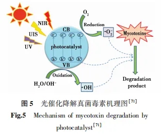 脉冲光(PL)是一种以脉冲形式发出的强光,能量高,在毒素降解中具有作用时间短的优势。Qi等在苹果汁中使用脉冲光技术进行毒素消减处理,AFTs的降解率随苹果汁深度和离灯距离的减小而增大。闪光40次后,AFB1、AFB2、AFG1和AFG2的降解率分别为72.09%、73.65%、57.06%和69.69%,且PL处理对苹果汁品质影响不大[63]。3.4 光催化降解技术