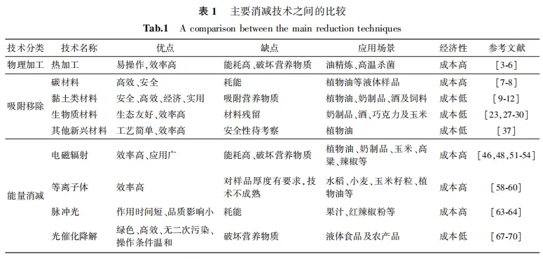 常见的物理消减技术如物理加工、吸附移除以及能量消减技术对食品及农产品中黄曲霉毒素的移除均具有显著效果,这些技术按照不同的方式可以细分为多种具体方法,其主要特点如表1所示。根据表1给出的结果可知,无论是哪一种物理消减技术,在应用过程中均存在不足,常见的缺点是对营养物质的破坏以及技术及材料引发的安全性问题有待加强。另外,不同技术的应用场景可能存在不同,目前在植物油、奶制品、酒及饲料等产品中均有涉及,从经济性角度考虑,吸附移除方式整体成本比物理加工及能量消减技术低。.jpg)