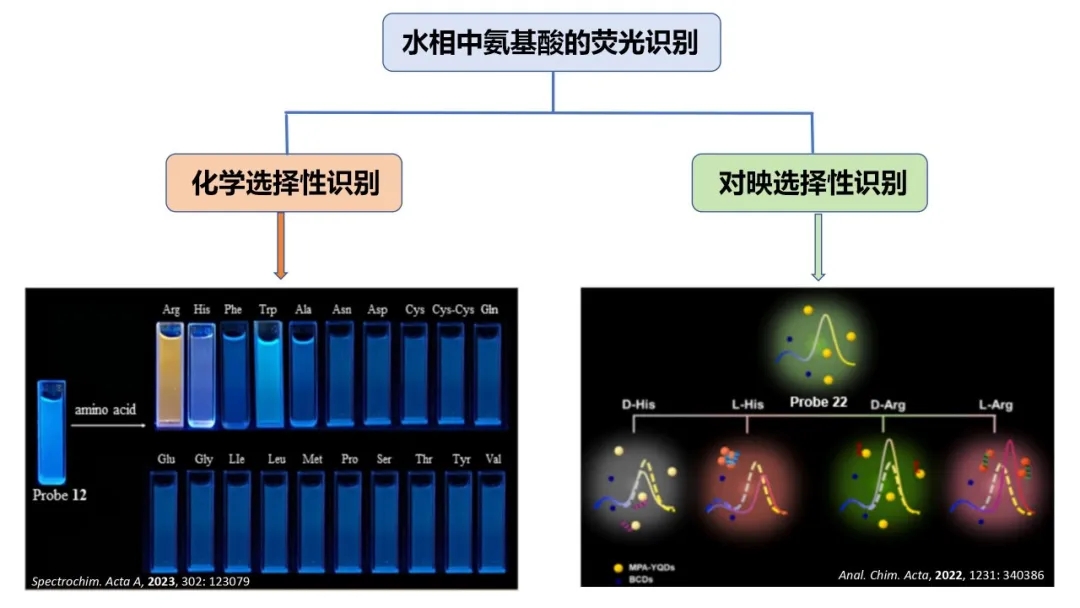 氨基酸作为构成生物体的重要分子之一,其不仅是蛋白质的组成单元,也是细胞构建和组织修复的基础物质。另外,氨基酸也是一种重要的手性物质。不同种类,以及同一种类但不同构型的氨基酸,都各自发挥着不同的作用。氨基酸类别和手性构型的识别与分析不论是在生物医学领域,还是在以氨基酸为手性前体和手性配体的不对称合成领域,都具有重要的研究意义。由于天然存在的氨基酸大多具有良好的亲水性,因此水相中对氨基酸的识别尤为重要。