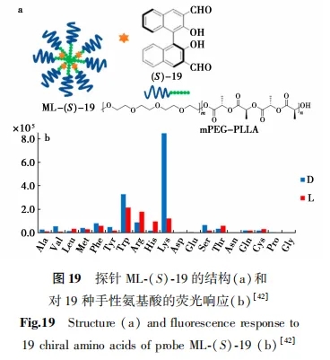 基于以上综述可知,应用于氨基酸分子识别的水溶性荧光探针的研究工作主要集中在两个方面,一是探针分子的亲水性结构改造,二是探针对氨基酸分子识别的应用范围拓展。在亲水性分子结构改造方面,主要有以下三种策略:(1)亲水性片段的引入,包括亲水性盐如磺酸盐、季铵盐等片段,以及亲水聚合物,如聚乙二醇片段等;(2)基于分子包裹的策略提高疏水性探针分子的水溶性;(3)亲水性碳点的合成。在这三种策略中,亲水性片段的引入是一种最直接的分子改造方法,这种方法不改变探针分子原有的骨架结构及识别基团,研究的也是最多的。分子包裹策略往往要同时考虑被包裹的探针分子对氨基酸底物的识别活性基团要有效地裸露在外相,或者氨基酸能进入包裹分子内部,否则将影响探针对水相中氨基酸的分子识别能力。另外,应用于氨基酸对映选择性分子识别的水溶性荧光探针的构建具有更大的挑战性,原因是在分子设计中除了要考虑探针分子的亲水性及与氨基酸作用后的荧光响应变化,还同时要考虑探针分子刚性的手性结构及对其中一种构型的氨基酸的手性偏倚。以上三种策略中,包裹性亲水结构改造的方法往往会将探针的主体手性骨架包裹在内部,如果氨基酸是在外相与探针分子的识别基团作用,此时,探针分子对氨基酸的对映选择性识别能力将会大大降低。在水相中荧光探针对氨基酸的分子识别应用方面,目前的研究主要是对氨基酸的化学选择性识别的应用,包括溶液体系中的化学选择性识别,溶液中氨基酸浓度的定量测定,细胞中内源性及外源性氨基酸的成像,血浆中、食品中氨基酸的检测等。而水相中氨基酸的对映选择性识别的应用基本上都是局限于溶液体系中对氨基酸的手性的识别以及光学组成的测定,很少有细胞和生物体内氨基酸手性荧光识别的研究报道。