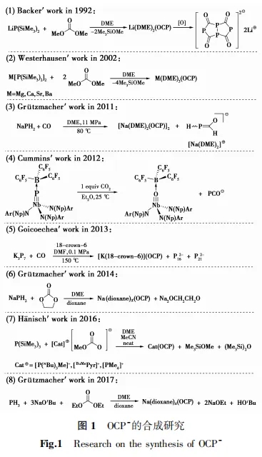 1992年,Becker等[2]首次合成了OCP-并对其进行了结构表征。该小组将二(三甲基硅基)磷化锂与碳酸二甲酯反应生成Li(DME)2(OCP) (DME = 1,2-乙二醇二甲醚) [δ31P = -384.2]。并通过单晶XRD证明了该产物中Li-O之间存在强离子对作用,更有利于共振结构-O-C≡P,见图1工作(1)。.jpg)