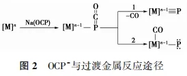 由于OCP-的性质及反应活性与N3-及OCN-相似,因此在关于OCP-的反应研究中也可以受到此类阴离子反应性的启发。根据推测,OCP-与过渡金属形成的金属配合物[M]-P=C=O,在脱羰基后可形成具有末端金属化合物[M]P。根据金属中心的价电子数,将该反应途径归纳为两种,途径1:缺电子的过渡金属,可通过失去CO形成末端金属配合产物。途径2:富电子的过渡金属,CO(强π-电子受体)从P中心迁移到过渡金属形成金属羰基化合物中心,该过程不存在CO的离去(图2)。