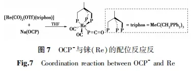 2011年,Graham等[17]采用Na2[CpV(CO)3]与Cl2PNR2反应,合成了首个热稳定、中性、亲电的钒亚膦配合物[CpV(CO)3{η-P-(NR2)}] (R=iPr, Cy)并进行了结构表征,该配合物也是钒的第一个亲电亚膦配合物。2012年,Grützmacher等[21]合成了第一个具有末端磷氰酸阴离子(PCO-)的过渡金属配合物。该反应研究基于该组关于异氰酸酯(NCO)配合物的合成衍生而来。该组采用过渡金属配合物前体[Re(OTf)(CO)2(triphos)]与PCO-在THF溶液中得到产物,并对其进行结构表征。通过对产物的键长键角、波谱学及电子结构进行分析可知:在异氰基配合物(M-N+≡C=O-)中,其M-N-C接近线性,而金属磷烯酮配合物(M-P=C=O)的M-P-C中心则强烈弯曲,由此证明为高度共价性质的ReI-磷键(图7)。