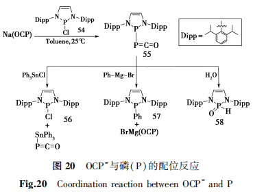 环丁二烯具有芳香4π电子平面,其反应活性高,不利于分离纯化。2016年,Grützmacher等[34]报道了首个4π电子稳定的1,3二甲基-2,4-二磷酸环丁二烯(47)的合成。该组使用OCP-与氮杂环金属氯化物44反应形成锗金属的磷配合物45,该物质进一步光解致CO从化合物45的P=C=O基团中释放,形成瞬态中间体,即锗-磷三键态化合物46。2015年,Grützmacher等[38]报道了Na(OCP)与不饱和的氮杂环磷氯54反应生成黄色结晶固体55,单晶XRD证明其为具有异常键长P-P键[2.4414(5)Å]的磷取代磷烯酮[δ31P = -233、165]。化合物55与Ph3SnCl/Ph-Mg-Br发生复分解反应生成产物56及57,证明了化合物55是紧密的离子对结构。而将化合物55水解只得到含磷产物58。该组研究证明化合物55以固态形式可保存数周,但在溶液中会发生重排形成带有P=P双键的五元杂环中间体(图20)。