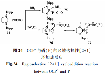 2013年,Bertrand等[43]使用两种不同的硼中心路易斯酸与底物74反应,其中当底物74与过量BH3的反应产生了经典的磷氰酸-硼烷配合物75,该反应中BH3与五元二氮杂环的P原子形成简单的配位键。为了了解亲核试剂的区域选择性,改用Lewis酸性及位阻更大的B(C6F5)3与底物74反应时,产生了环化产物76与77的混合物,在31PNMR谱中观察到的,在δ= +206和-11(JPP = 215 Hz)处具有两个尖锐的双峰。单晶X射线衍射证明了两性离子二磷鎓盐的形成,这是一种新型的2π-电子芳香体系。从机理上分析这种反应发生是由于硼烷与氧原子的相互作用导致磷烯酮基团与环上P中心之间的环化反应(图24)。.png)