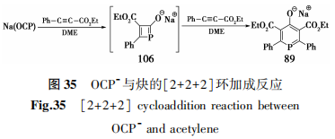 2014年,Grützmacher等[47]使用Na(OCP)与苯乙炔基羧酸乙酯在DME中回流经历了[2+2+2]环加成合成了含磷六元杂环阴离子的钠盐107(δ31P = 91.9)。该过程经历了两次环化,其中间体含磷四元杂环化合物106可在31PNMR中观察到化学位移为:δ31P = 153.2。该课题证明了OCP-环合的分步过程,而非一步获得,得到的含磷六元杂环阴离子化合物107可作为电子供体与活性金属形成配体以催化反应,可应用到配位化学和材料化学的研究之中(图35)。.png)