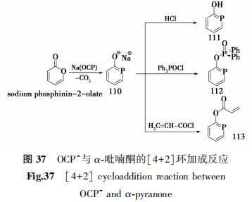 2014年,Grützmacher等[46]使用Na(OCP)与α-吡喃酮在25℃-60℃的温度下反应得到了 [4+2]环加成的含磷六元杂环111:磷-2-醇钠,该化合物稳定性高,可作为供电子基对氧进行各类官能团取代反应,在HCl质子化下形成膦-2-醇112。与氯二苯基氧化膦或丙烯酰氯进一步反应还得到了相应取代产物113与114(图37)。.png)