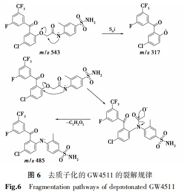 Wang等[10]提出苯氧基-N-苯基乙酰胺衍生物去质子化的GW4511的裂解规律,其中SNi过程占主导地位而Smiles重排用于解释m/z 485离子的生成(图6)。.jpg)