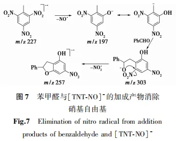Chen等[11]提出在CI负离子条件下,TNT自由基负离子经消除一氧化氮自由基而生成的产物离子可与苯甲醛发生加成反应,且加成产物离子可以通过Smiles重排消除硝基自由基(图7)。.jpg)