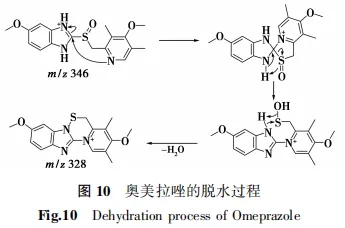 Weidolf等[14]用ESI-MS/MS和同位素标记法研究奥美拉唑的裂解规律,提出吡啶氮的亲核进攻导致了五元环螺状中间体的形成,而后亚硫酰基的氧攫取氢,最终脱水生成碎片离子(图10)。.jpg)