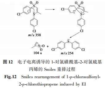 Hill等[17]提出了一种EI诱导的Smiles重排,其中二价硫化物可以发生Smiles重排,而四价的亚砜和六价的砜不会发生Smiles重排。其原因可能是:硫原子因为被氧化成亚砜/砜而少了一对孤对电子(图12)。.jpg)