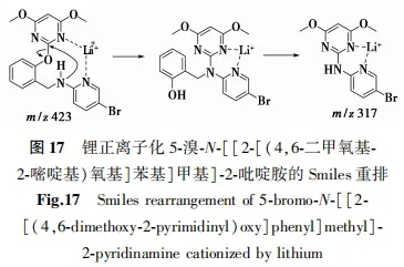 作为一种不同于质子化的离子化方式,碱金属正离子化可能改变电荷位点并促进不同的裂解途径。反之亦然,如果碱金属加合离子未能提供富含信息的碎片离子,则说明质子对于该反应是至关重要的[25]。Wang等[26]指出2-嘧啶氧基-N-芳基苄胺衍生物的锂加合离子的裂解产物与质子化的裂解产物不尽相同,原因是锂离子改变了电荷位点,且锂离子与吡啶氮和嘧啶氮的配位效应促进了不同的裂解过程(图17)。