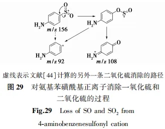当磺酰基上的氧向苯环进攻造成C–S键断裂时,这类磺酰基-亚磺酸酯重排可被视为气相Smiles重排。但需要注意的是磺酰基-亚磺酸酯重排中氧的孤对电子也可能朝非苯环侧进攻,例如RSO2Ar经过重排可以生成ROS(=O)Ar也可以生成RS(=O)OAr[41, 42]。类似的也有硝基-亚硝酸酯重排,比如硝基甲烷可以重排为亚硝酸甲酯[43]。Wang等[44]和Guo等[45]都提出对氨基苯磺酰基正离子经过从磺酰基-到亚磺酸酯的重排消除一氧化硫和二氧化硫的过程(图29)。