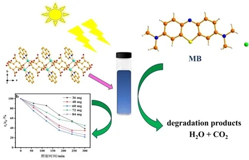1.报道了一例新型镉基MOF光催化材料,可有效降解亚甲基蓝染料,光催化反应过程符合一级动力学方程;