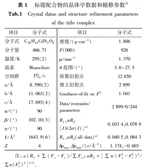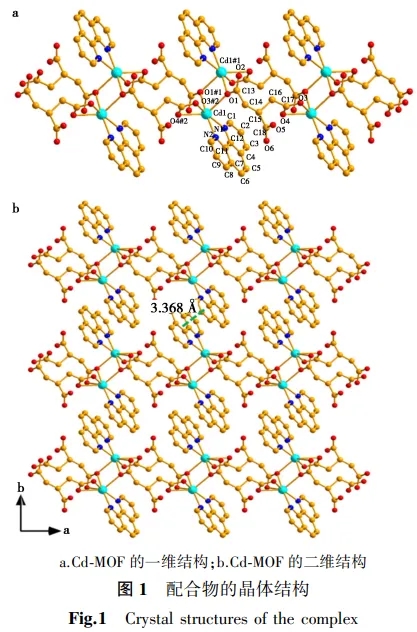 X射线单晶衍射数据分析表明,标题配合物属于单斜晶系中的P21/c空间群,不对称结构单元中包含一个Cd2+离子,一个邻菲罗啉配体和一个质子化的丙烷三羧酸根。如图1a所示,镉离子与来自3个不同的1, 2, 3-丙烷三羧酸配体的4个羧基氧原子(O1, O1#1, O3, O4; #1 = -x+1, -y+1, -z)和一个邻菲罗啉配体上的两个氮原子发生配位,形成畸变的八面体。