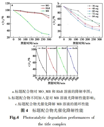 通过实验对比了标题配合物对不同染料光催化降解性能。在光催化之前,黑暗下搅拌30 min后,标题配合物对MB、MO、RhB的吸附率分别为0%、0.8%、0.9%。如图4a所示,在氙灯照射300 min后,Cd-MOF对MB、MO、RhB(溶液溶度为10 mg/L)的降解率分别为75.3%、12.5%、21.8%,可得出标题配合物对亚甲基蓝催化降解效率最高,原因可能是亚甲基蓝分子中最活泼的基团-S-吸引标题配合物中强氧化基反应,进而加快对亚甲基蓝的催化降解[23]。