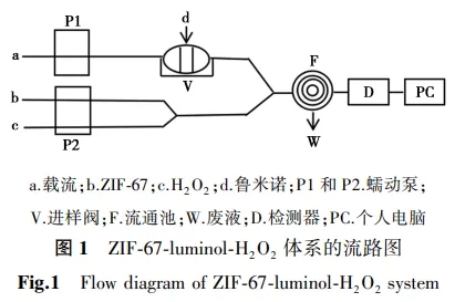 - 图1为ZIF-67-luminol-H2O2体系的流路。