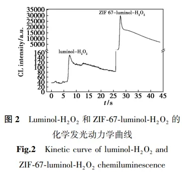 Luminol-H2O2体系的化学发光动力学,可以通过静态注射法进行测定。取出化学发光检测器中流通池,放入石英烧杯,加入1.0 mL(5×10-6 mol/L)luminol溶液,此时信号为基线信号,从检测器上方注射孔用注射器注入0.5 mL(1.0×10-6mol/L)H2O2溶液,此为luminol-H2O2体系的化学发光动力学。图2为ZIF-67 NSs加入前后luminol- H2O2体系的化学发光动力学。从图2可知,ZIF-67 NSs能显著增强luminol-H2O2体系的化学发光。.jpg)