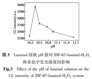 图3为ZIF-67-luminol-H2O2体系的化学发光强度受luminol溶液pH值的影响结果。从图3可知,增加luminol溶液的pH值,ZIF-67-luminol-H2O2体系的化学发光强度呈现先增后降趋势,化学发光强度在pH 10.35时最大,故选择体积比为4:6的0.1 mol/L NaHCO3-Na2CO3缓冲液(pH 10.35)作为luminol溶液的缓冲介质。.jpg)