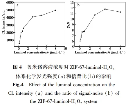ZIF-67是一种典型的沸石咪唑酯类骨架结构材料,它是由二价钴离子(Co2+)与有机配体2-甲基咪唑自组装形成类似沸石结构的金属有机骨架材料,常被作为载体或模板合成复合纳米材料,但其本身的纳米酶催化活性研究不多,甚至报道没有纳米酶催化活性,这可能与其形貌和粒径等有关。文献报道ZIF-67纳米片作为纳米酶的研究方法主要基于比色法评价,而应用于高灵敏的化学发光分析法评价纳米酶催化活性较少,因此系统研究ZIF-67纳米片对luminol-H2O2化学发光的催化作用很有必要。
