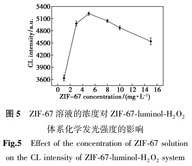 设定鲁米诺溶液的浓度为5.0×10-6 mol/L,过氧化氢的浓度为1.0×10-6 mol/L,鲁米诺溶液的pH控制为10.35时,ZIF-67溶液的浓度依次为1、3、5、8、10、15 mg/L,测定不同ZIF-67溶液浓度下体系的化学发光强度,记录体系的化学发光强度和背景值,计算不同ZIF-67溶液浓度下的绝对发光强度,如图5所示。.jpg)