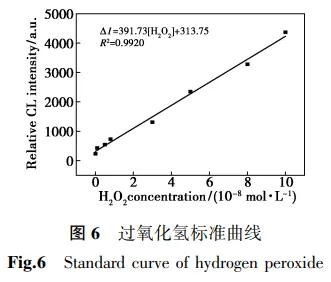 图6为ZIF-67-luminol-H2O2体系的相对化学发光强度与过氧化氢浓度之间的线性关系图。由图6可知,过氧化氢在浓度1.0×10-10~1.0×10-7 mol/L范围内存在良好线性相关关系。线性方程为∆I =391.73[H2O2]+313.75,相关系数为R2=0.9920。.jpg)